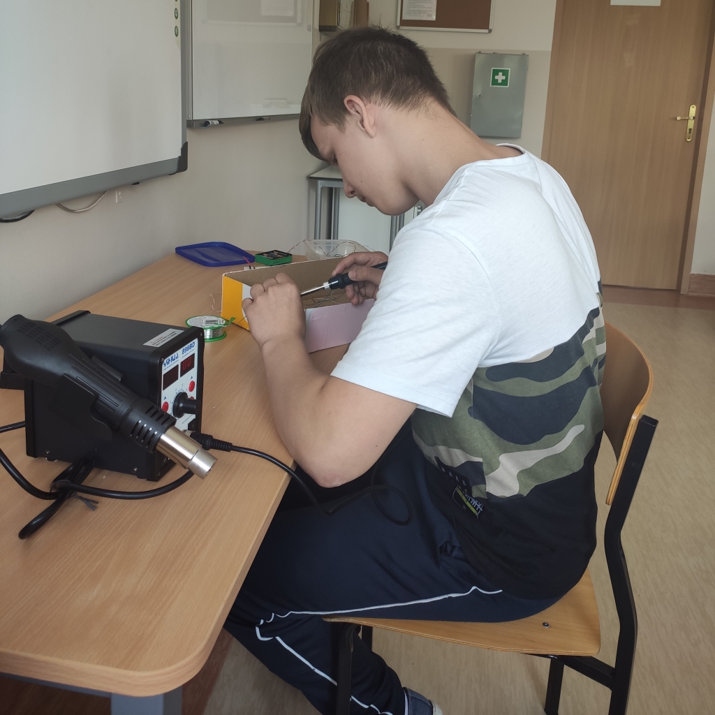 Uczniowie klasy 6a i 6b podczas lekcji techniki zaprojektowali i wykonali grę - rozpoznawanie symboli elementów elektronicznych. W pracy wykorzystane były przybory do obróbki metalu, stacja lutownicza z gorącym powietrzem zakupiona w ramach realizowanego projektu #laboratoriaprzyszlosci. Zastosowanie i działanie elementów elektronicznych sprawdzano na płytkach stykowych oraz wprowadzane zostały elementy programowania.