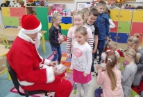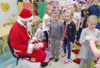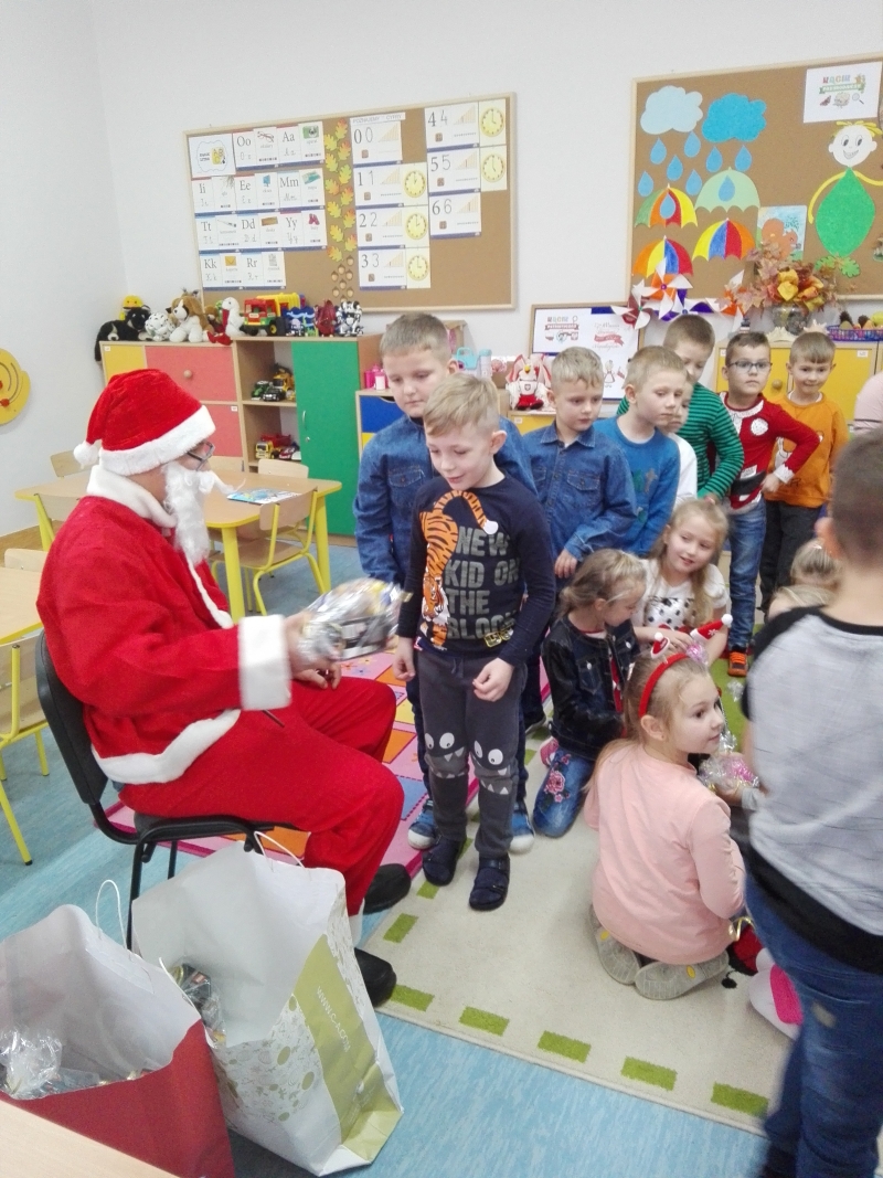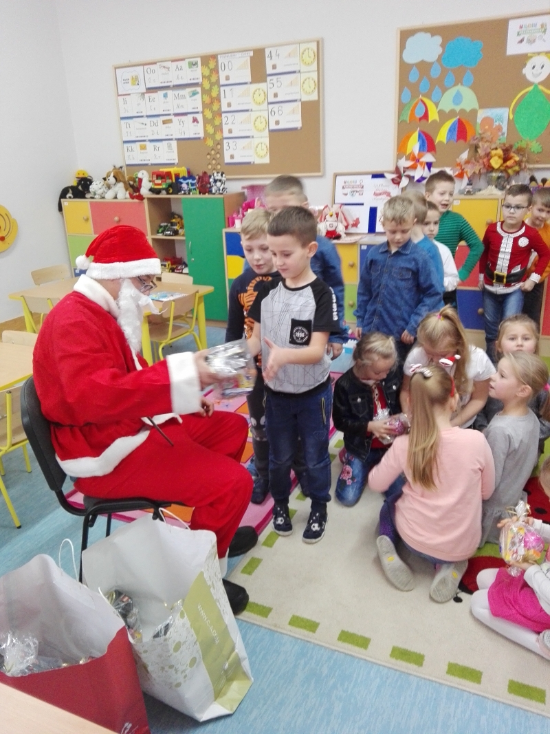 Już od samego rana sześciolatki z oddziału przedszkolnego nasłuchiwały, czy nie słychać dźwięku dzwonka Św. Mikołaja. Pomimo braku białego puchu niezawodnie przybył Św. Mikołaj. Na jego wizytę dzieci cierpliwie czekały. Wcześniej nauczyły się piosenki, którą specjalnie dla Niego przygotowały. Spotkanie z Mikołajem minęło w bardzo miłej atmosferze. Dzieci powitały gościa piosenką. Na koniec po zapewnieniach, że będą się starały zachowywać grzecznie w domu i w oddziale przedszkolnym, Mikołaj obdarował je oczywiście prezentami.
