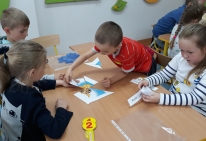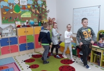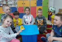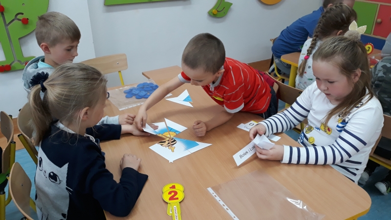 Po przywitaniu gości, dzieci rozpoczęły zajęcia piosenką pt. „Książeczki, bajeczki”. Dzieci podzielone na trzy drużyny (niebieską, żółtą i czerwoną) brały udział w quizie dotyczącym znajomości bajek i baśni. Rozwiązywały zagadki, słuchały fragmentu bajek i określały, z jakiej bajki on pochodzi, układały bajkowe puzzle, odgadywały tytuł bajki po wyjętym z kufra rekwizycie. Nie zabrakło również zabawy ruchowej, podczas której naśladowały siedmiu krasnoludków idących do pracy. Jury składające się z rodziców przydzielało uczciwie punkty za poprawnie wykonane zadanie. Była świetna zabawa, dużo uśmiechów i radości. Dzieci wykazały się dużą znajomością bajek. Pracowały ambitnie i z zaangażowaniem. Na zakończenie wszyscy otrzymali za wspaniałą zabawę odznaki „Znawca bajek”. Dziękujemy rodzicom za liczne przybycie i wspaniałą zabawę!
