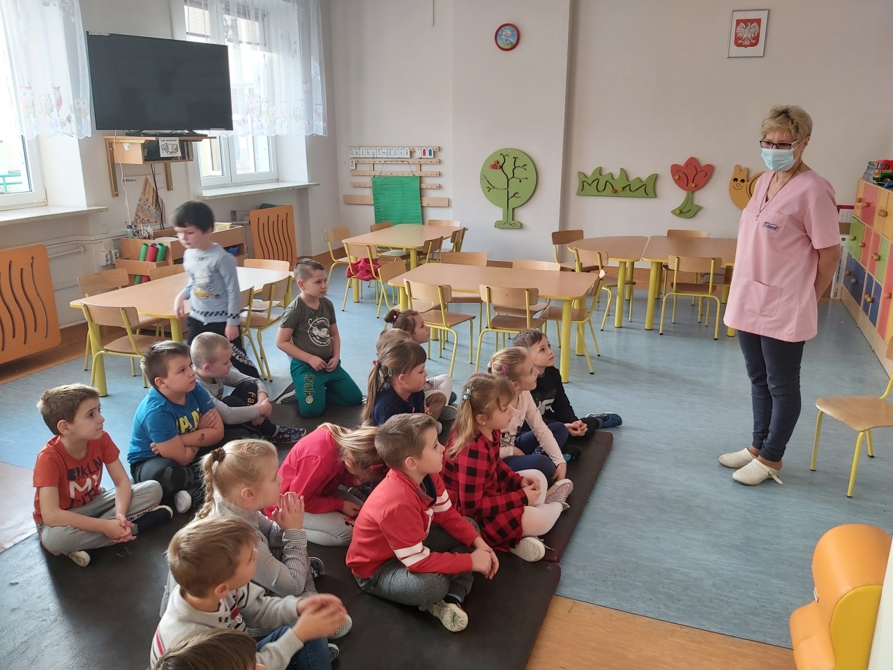 Dnia 22 stycznia 2021 r. do oddziału przedszkolnego zawitała pani Urszula Filipczak, która jest pielęgniarką w naszej szkole. Podczas spotkania dzieci miały okazję dowiedzieć się więcej o trudnym zawodzie pielęgniarki, pokonać lęk przed zabiegami medycznymi, a przede wszystkim wzbogacić swoje wiadomości na temat sposobów dbania o zdrowie. Pani pielęgniarka przypomniała dzieciom jak należy się ubierać odpowiednio do pogody, jak właściwie się odżywiać i jak zachować zasady higieny i zdrowego stylu życia, szczególnie teraz w czasach pandemii COVID19.