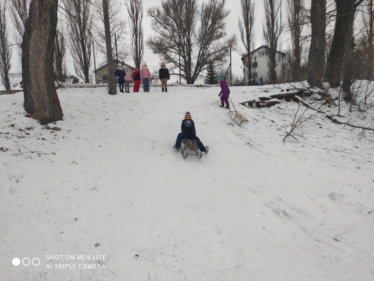 29 stycznia 2021 r. korzystając z warunków pogodowych, uczniowie klasy III b pod opieką nauczyciela wychowania fizycznego p. Leszka Wiszniewskiego oddali się zimowemu szaleństwu. Uczniowie w ramach zajęć wychowania fizycznego zjeżdżali na sankach.