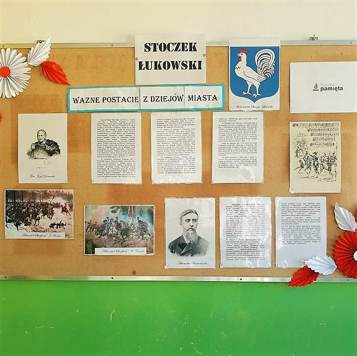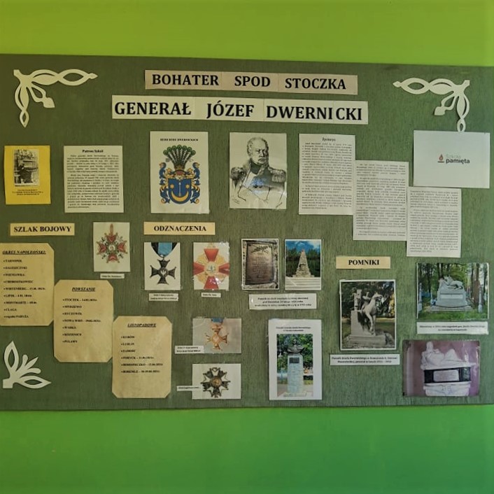 Na szkolnych korytarzach zostały przygotowane gazetki przedstawiające bohaterów lokalnych i narodowych. Jedna z nich poświęcona jest bohaterowi spod Stoczka, generałowi Józefowi Dwernickiemu, który to 14 lutego 1831 roku stoczył pod Stoczkiem zwycięską bitwę w powstaniu listopadowym z przeważającymi siłami wojsk rosyjskich. Generał Józef Dwernicki jest patronem naszej szkoły i jak co roku, tak również w tym roku szkolnym będzie przygotowywana uroczysta akademia z okazji Dnia Patrona Szkoły. Natomiast druga upamiętnia postacie związane z naszym regionem, są to: Stanisław Wielgosek, Aleksander Świętochowski oraz Józef Dwernicki.