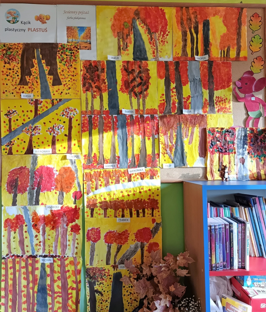 - Wykonanie pracy plastycznej „Pejzaż jesienny”- farba plakatowa (ed. plastyczna)