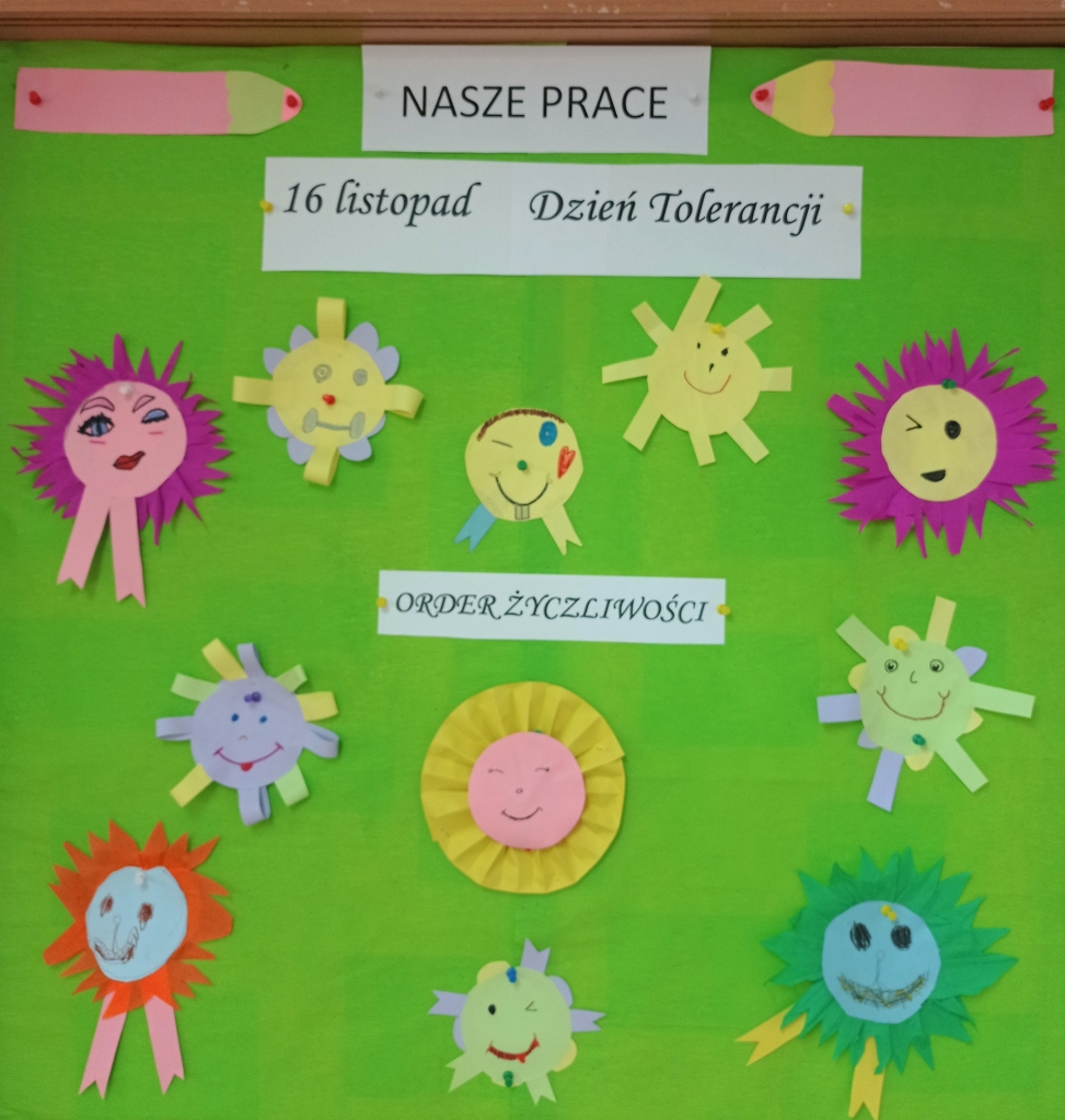 16 listopada to Międzynarodowy Dzień Tolerancji i w związku z tym w świetlicy szkolnej odbyły się zajęcia pod hasłem „Jesteśmy tolerancyjni”. Uczniowie oglądali filmy edukacyjne: „Tolerancja” oraz „Urodziny Maćka, czyli kilka słów o tolerancji”. Filmy stanowiły podstawę do dyskusji na temat tolerancji. Zajęcia miały na celu kształtowanie u uczniów empatii i tolerancji wobec innych. Na koniec uczniowie wykonali ordery życzliwości, które ozdobiły świetlicową tablicę.