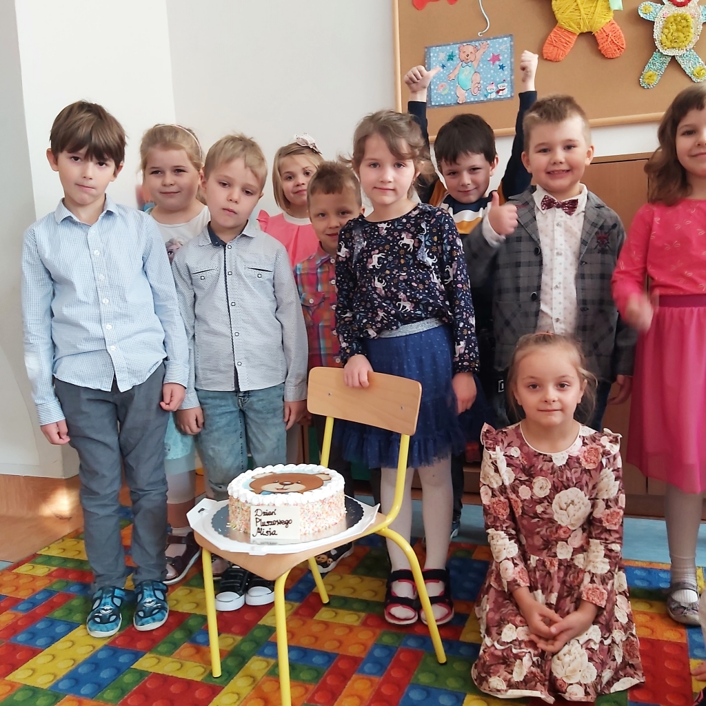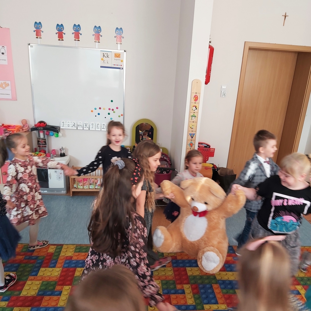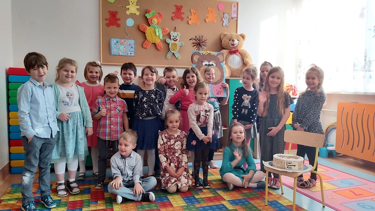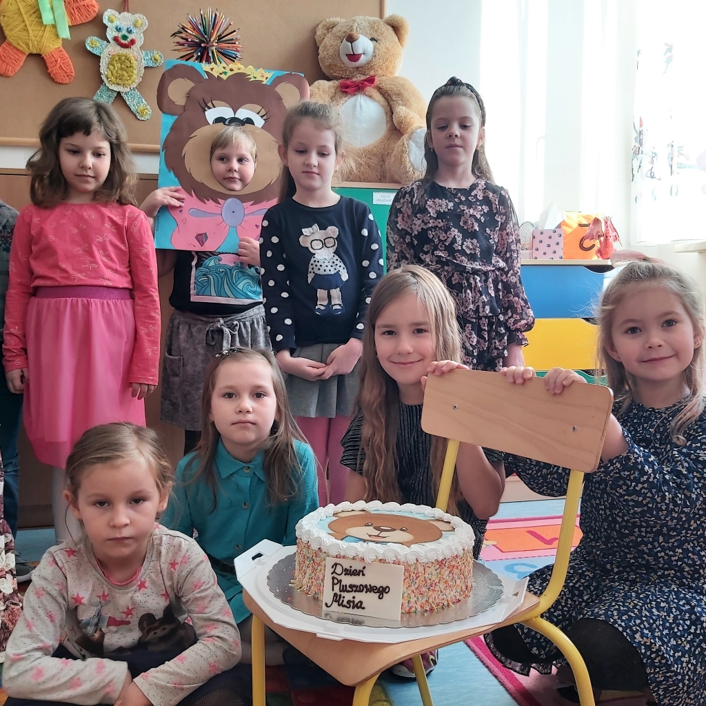 Tego szczególnego dnia do dzieci z oddziału przedszkolnego przybył ich ulubiony pluszowy miś, który był honorowym gościem. Spotkanie rozpoczęło się od zapoznania dzieci z historią pluszowego misia oraz przypomnienia najsławniejszych bohaterów spotykanych w dziecięcej literaturze i filmach animowanych. Następnie dzieci obejrzały projekcję popularnej bajki „Miś Uszatek”. Kolejnym punktem spotkania były zabawy z misiem, zabawy przy misiowych piosenkach oraz recytacja wiersza. Dzieci wspaniale poradziły sobie podczas zabaw. Przyszła pora na „Słodkie, małe co nie co” czyli tort w kształcie misia.