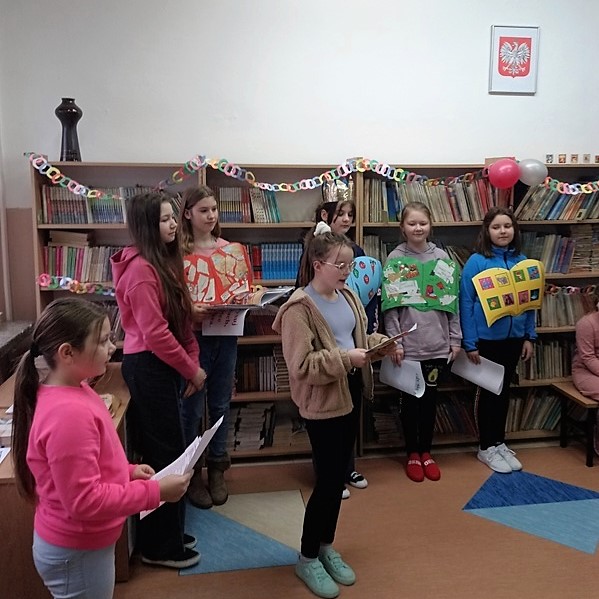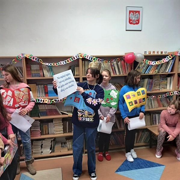 Uroczystość w bibliotece przeprowadził niezawodny aktyw biblioteczny - uczennice z klasy V b (Ania, Maja, Oliwia i Zuzia) i IV a (Basia, Daria i Oliwia).