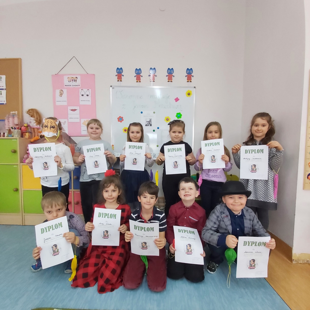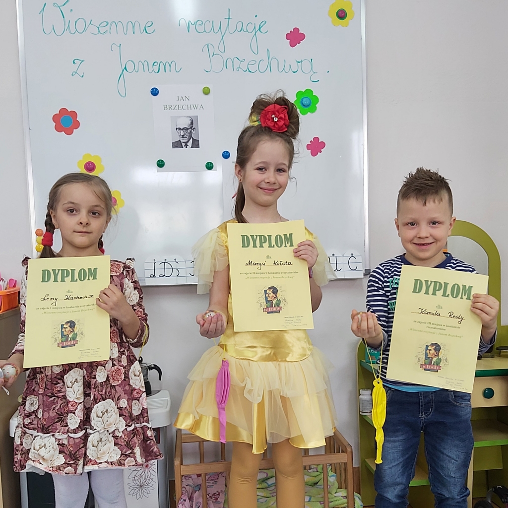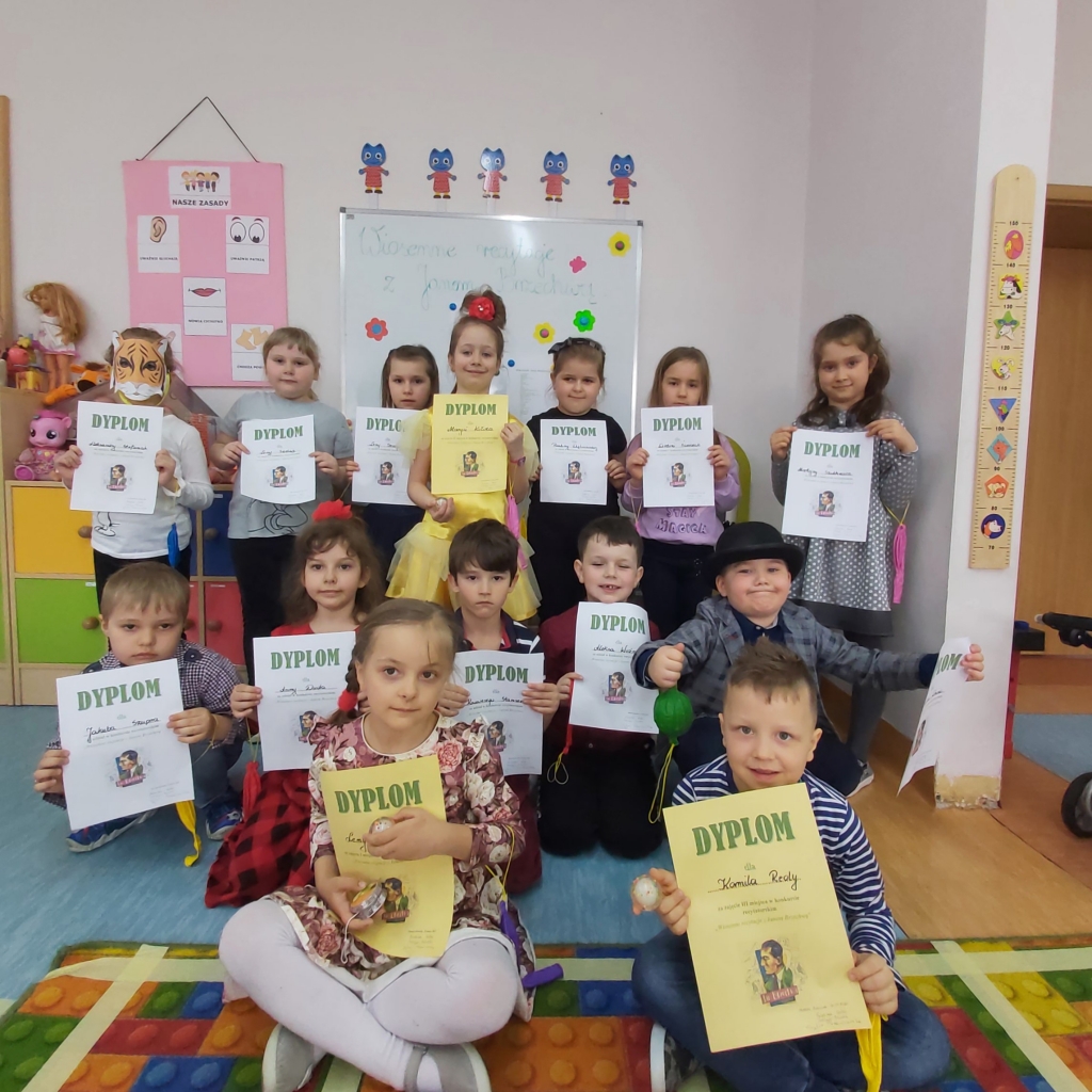 31 marca w oddziale przedszkolnym odbył się konkurs recytatorski „Wiosenne recytacje z Janem Brzechwą”. Celem konkursu było zapoznanie i zainteresowanie dzieci poezją Jana Brzechwy oraz kształtowanie wrażliwości na piękno poezji w języku ojczystym.