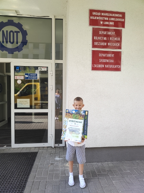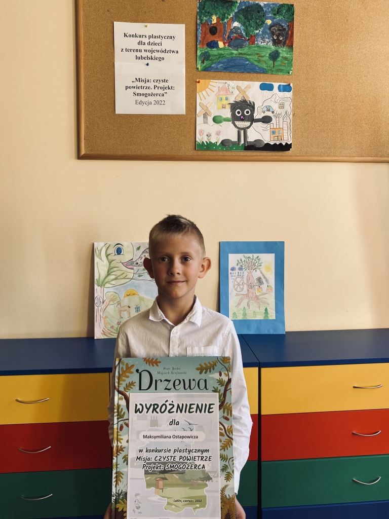 24 czerwca 2022 roku rodzice Maksymiliana Ostapowicza - ucznia klasy II a zostali poinformowani o wyróżnieniu jego pracy plastycznej w konkursie plastycznym dla uczniów trzech pierwszych klas szkół podstawowych z terenu województwa lubelskiego pt. "Misja: czyste powietrze. Projekt: "Smogożerca".