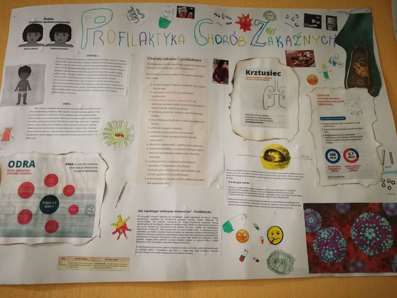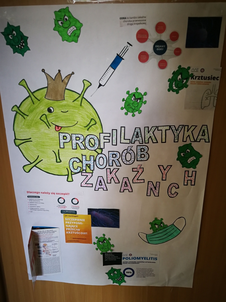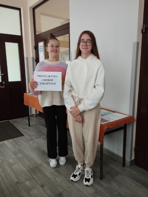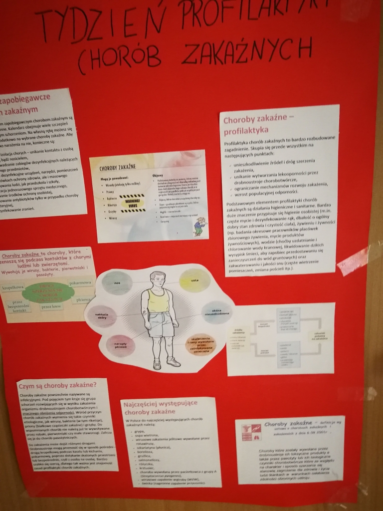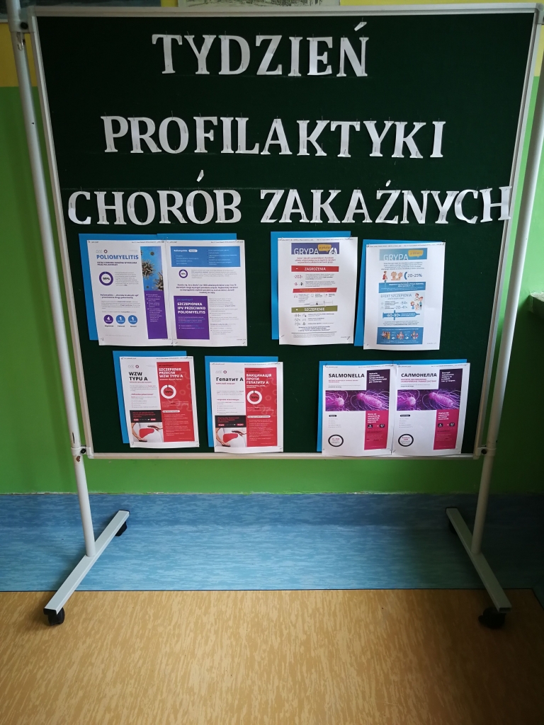 Dla rodziców przed wejściem do szkoły urządzono stoisko profilaktyczne z ulotkami informacyjnymi o chorobach zakaźnych, takich jak: grypa, krztusiec, WZW, poliomyelitis, odra, COVID-19. Dyżury przy stoisku pełniły uczennice z klas VI, VII i VIII.