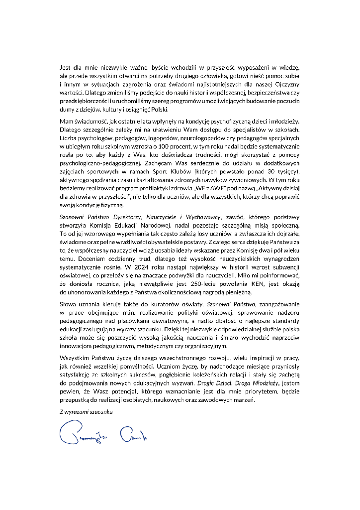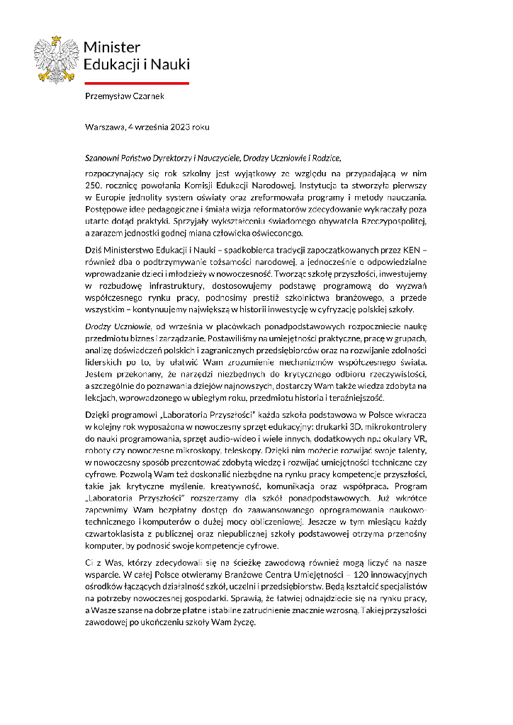 Pani Dyrektor życzyła uczniom sukcesów edukacyjnych w nowym roku szkolnym i zapoznała zebranych z fragmentem oficjalnego listu Ministra Edukacji Narodowej skierowanego do dyrektórow, nauczycieli, uczniów oraz ich rodziców, zawierającym życzenia wielu sukcesów edukacyjnych i wychowawczych. Po oficjalnej części uroczystości uczniowie wraz z wychowawcami udali się do wyznaczonych sal lekcyjnych.