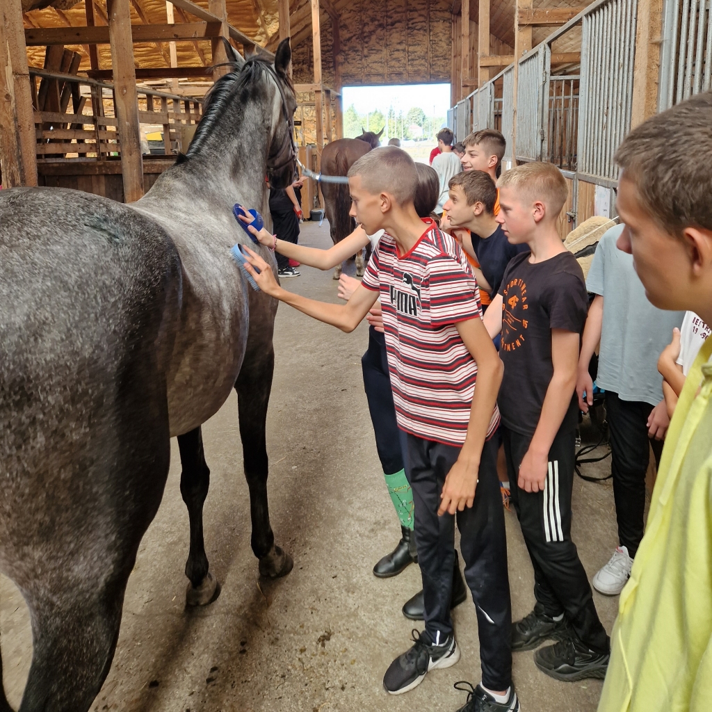 Młodzież doświadczyła, w jaki sposób o nie dbać, czesać, czyścić kopyta i osiodłać. Dowiedziała się czym karmić te piękne zwierzęta, by utrzymywać je w dobrej kondycji i zdrowiu. Po osiodłaniu koni każdy z uczniów pod okiem instruktora mógł skorzystać z jazdy konnej. Dziewczęta niezwykle zaangażowały się przekazując koleżankom i kolegom z klasy ważne wskazówki w początkowych jazdach.