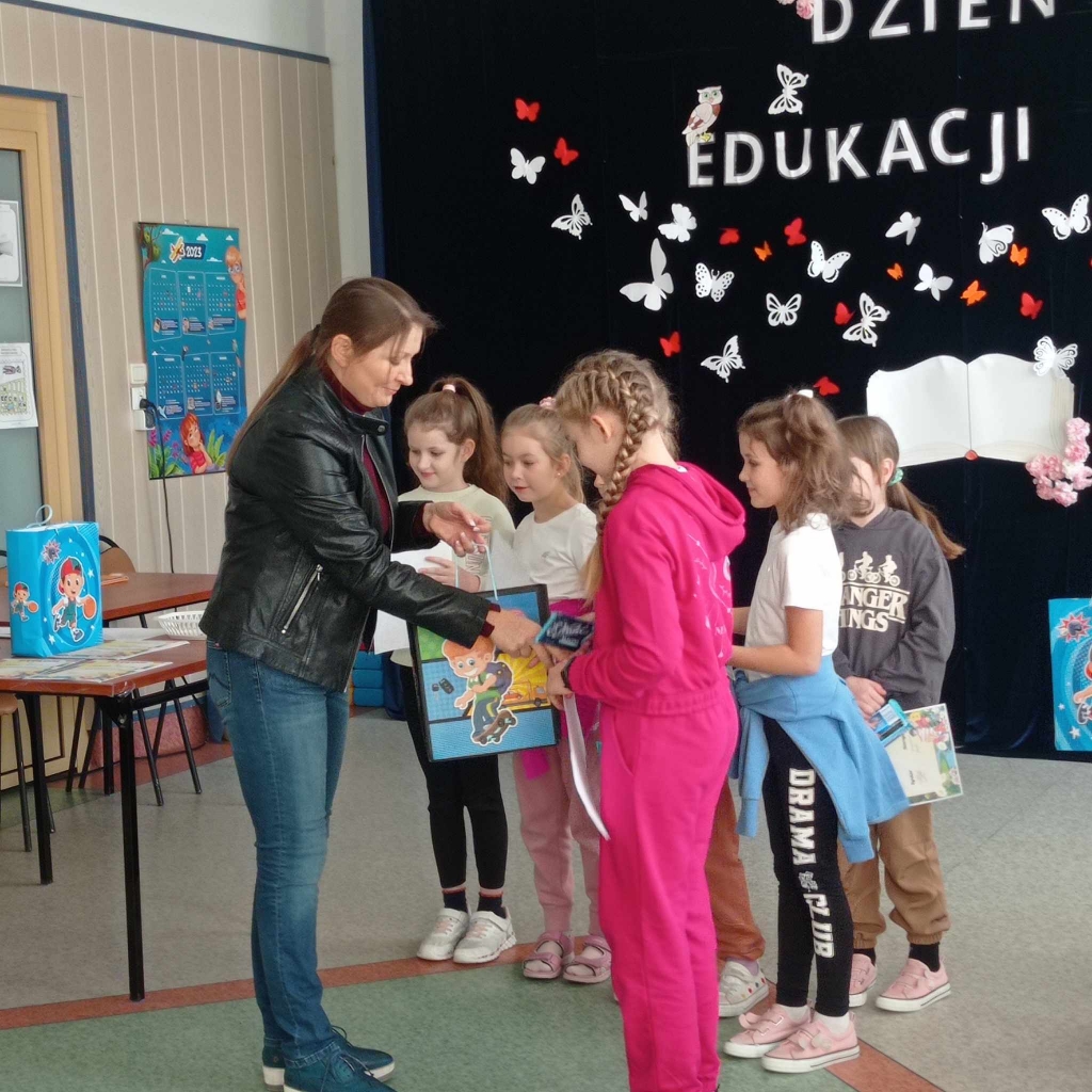 Wszyscy uczniowie za udział w zabawie otrzymali dyplomy i podziękowania. Osoby z poprawnymi odpowiedziami – słodką niespodziankę. Dodatkowo, wśród uczniów z poprawnymi odpowiedziami, w kategorii klas 1-3 oraz 4-8 nastąpiło dodatkowe losowanie nagród rzeczowych.