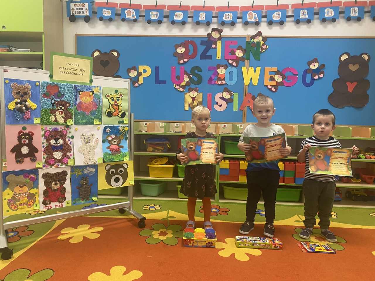 Pluszowy miś to najlepszy przyjaciel każdego malucha, ukochana maskotka na dobre i złe chwile. O jego święcie nie zapomniały dzieci z naszego przedszkola i oddziału przedszkolnego. 27 listopada każdy przedszkolak przyniósł swojego ukochanego misia. Dzieci poznały historię Święta Pluszowego Misia, oglądały bajki z misiowymi bohaterami, bawiły się przy piosenkach: „Pluszowy Miś", „Dwa malutkie misie", „Jadą, jadą misie" oraz brały udział w zabawach ruchowych, konkursach, quizach a także wykonały przepiękne prace plastyczne.