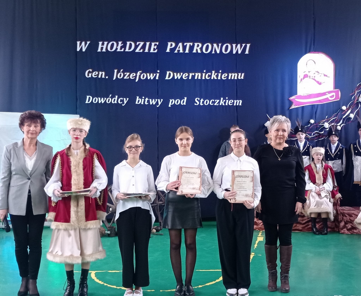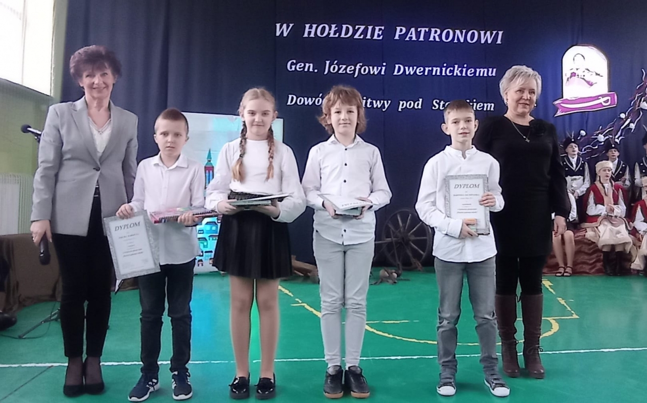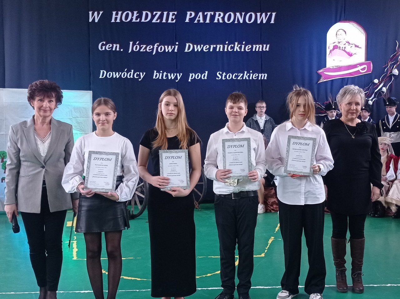 Dyrektor szkoły wraz z Burmistrzem i przewodniczącym Rady Miasta wręczyła uczniom stypendia za wyniki w nauce. Wicedyrektor szkoły p. Elżbieta Stodolska wręczyła dyplomy i nagrody za zwycięstwo w konkursach organizowanych z okazji obchodów Dnia Patrona Szkoły: literackim „List do patrona szkoły gen. Józefa Dwernickiego”, plastycznym „Portret patrona szkoły gen. Józefa Dwernickiego”.