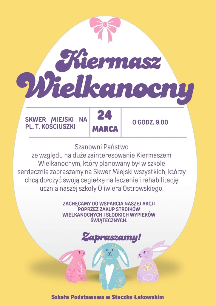 Serdecznie zapraszamy na kiermasz wielkanocny 24 marca, który rozpocznie się na skwerze miejskim w Stoczku Łukowskim już o godzinie 800.