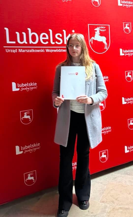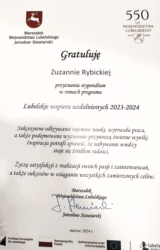 Zuzia znalazła się w gronie najlepszych uczniów w województwie, biorących udział w programie stypendialnym „Lubelskie wspiera uzdolnionych 2023 - 2024.”