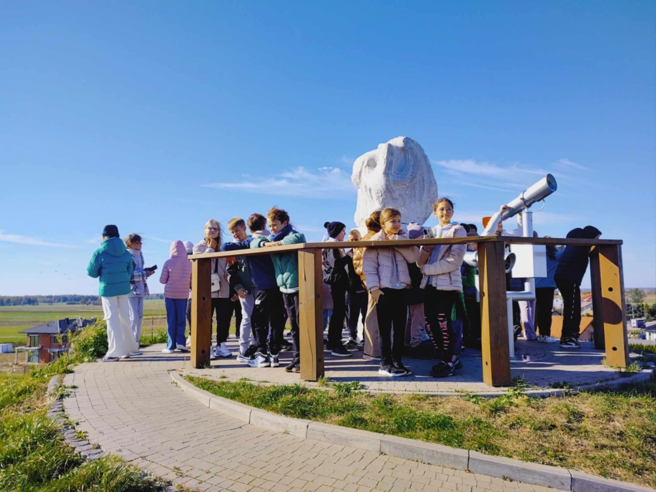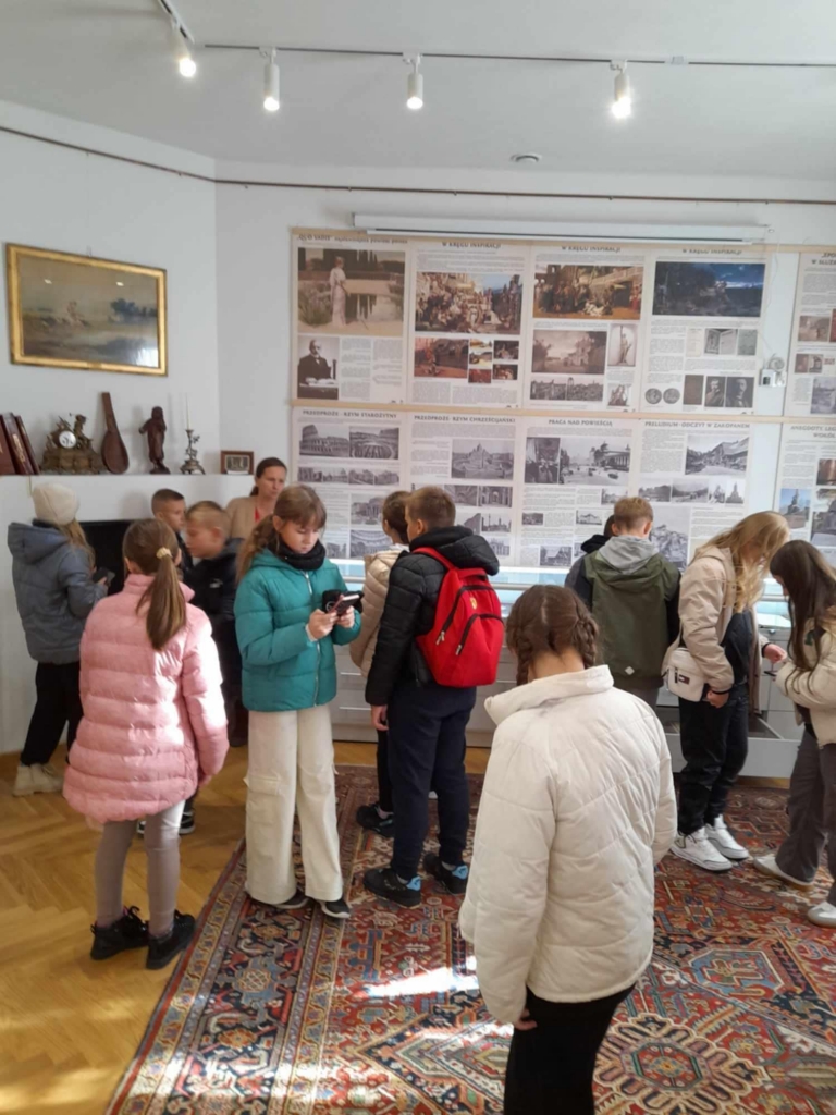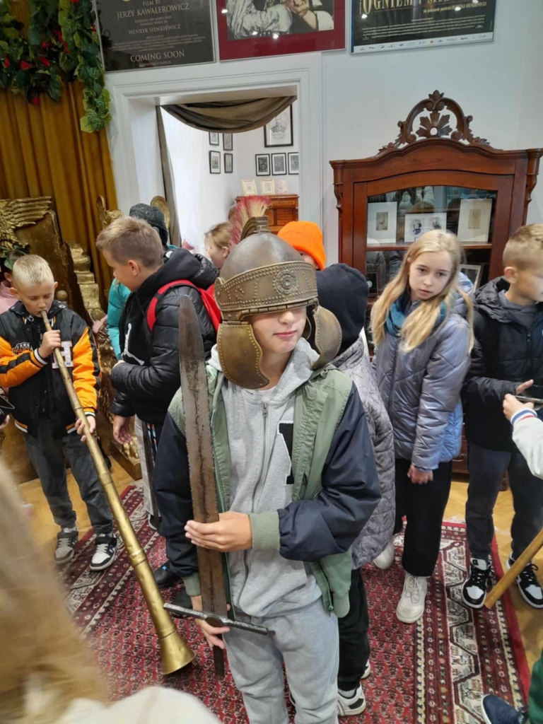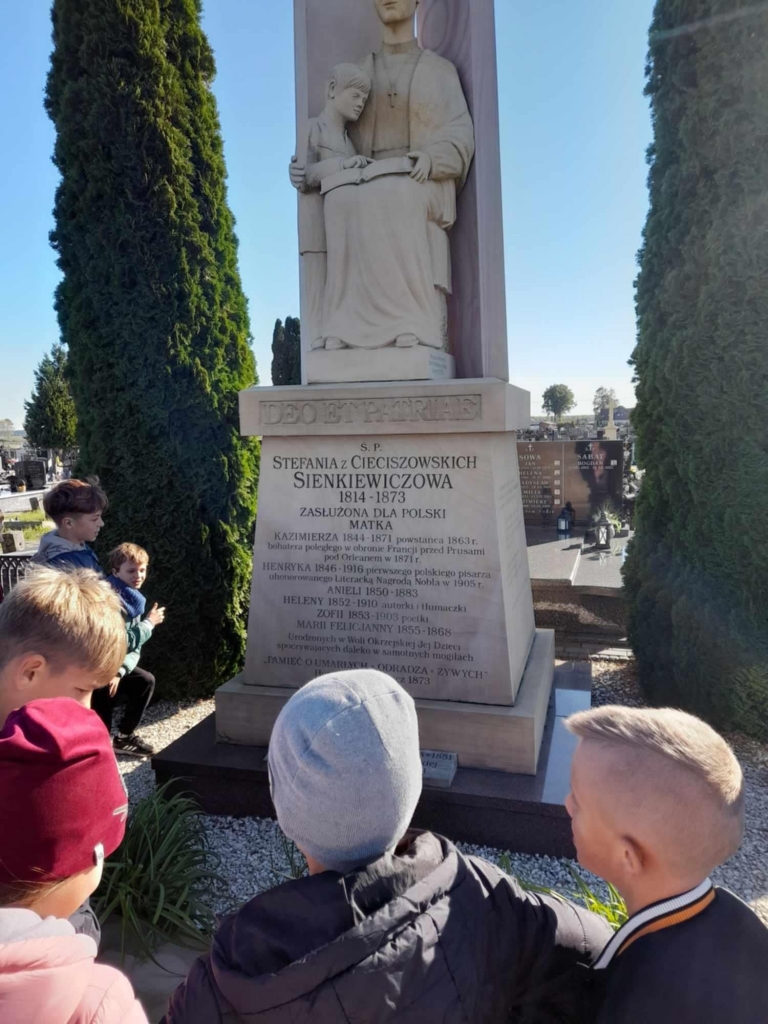 Najpierw udaliśmy się do miejsca urodzenia słynnego pisarza – noblisty Henryka Sienkiewicza. Zwiedziliśmy Muzeum w Woli Okrzejskiej. Poznaliśmy historię rodziny słynnego pisarza. Następnie udaliśmy się do Okrzei, gdzie w tamtejszym kościele, dwa dni po urodzeniu, Henryk został ochrzczony. Na pobliskim cmentarzu uczniowie oddali hołd, zapalając znicz na grobie matki pisarza – Stefanii z Cieciszowskich Sienkiewiczowej. Uczniowie wspięli się na kopiec Henryka Sienkiewicza w Okrzei, usypany w latach 1932–1938 przez społeczeństwo w hołdzie pisarzowi. Na szczycie kopca ustawiono widoczne z daleka popiersie Henryka Sienkiewicza, wykonane z białego marmuru.