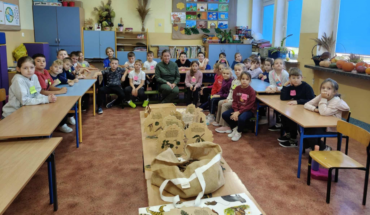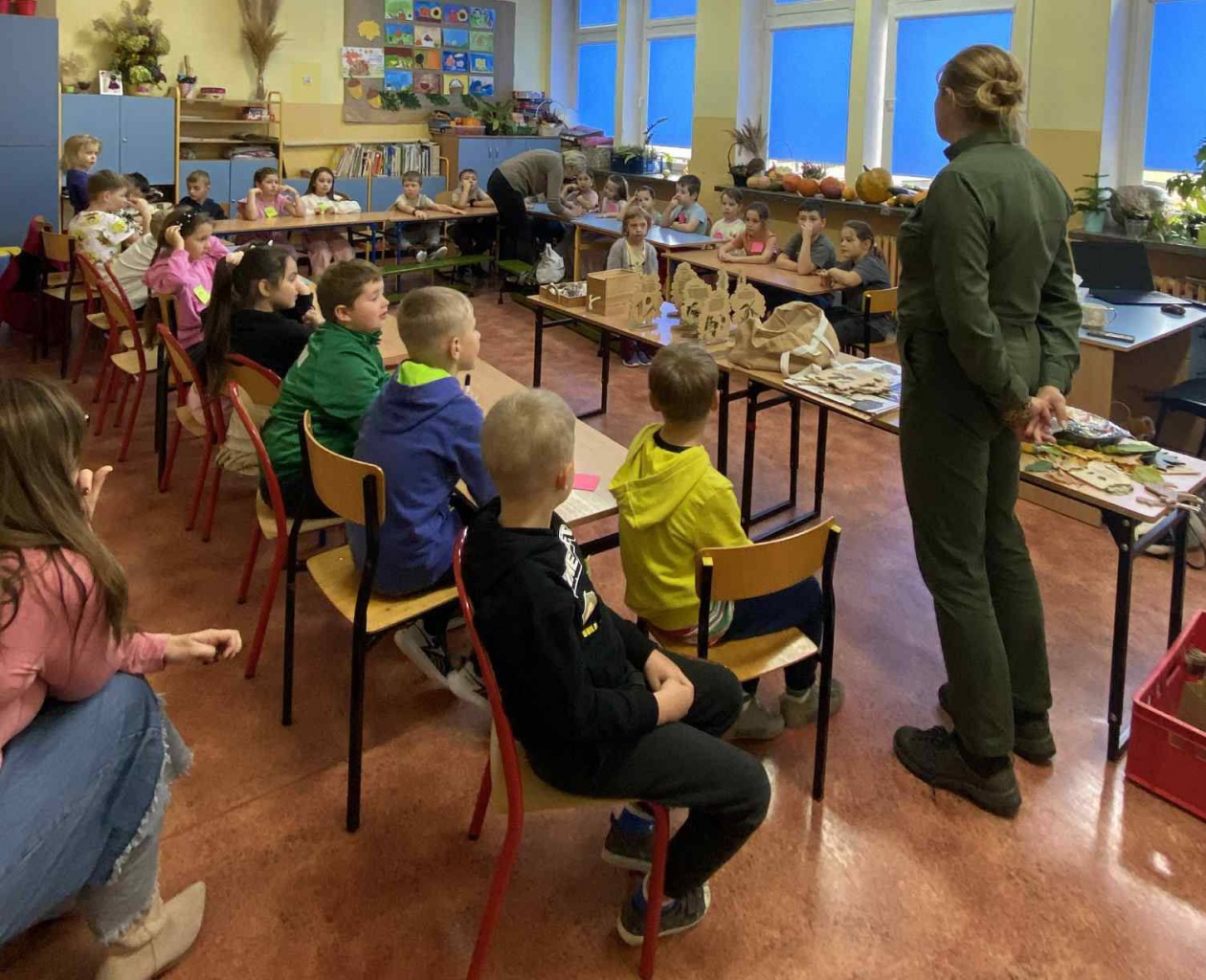 Oddział przedszkolny oraz uczniowie klas I-III uczestniczyli w zajęciach edukacyjnych przeprowadzonych przez P. Karolinę Barc - leśnika z Nadleśnictwa Łukow.