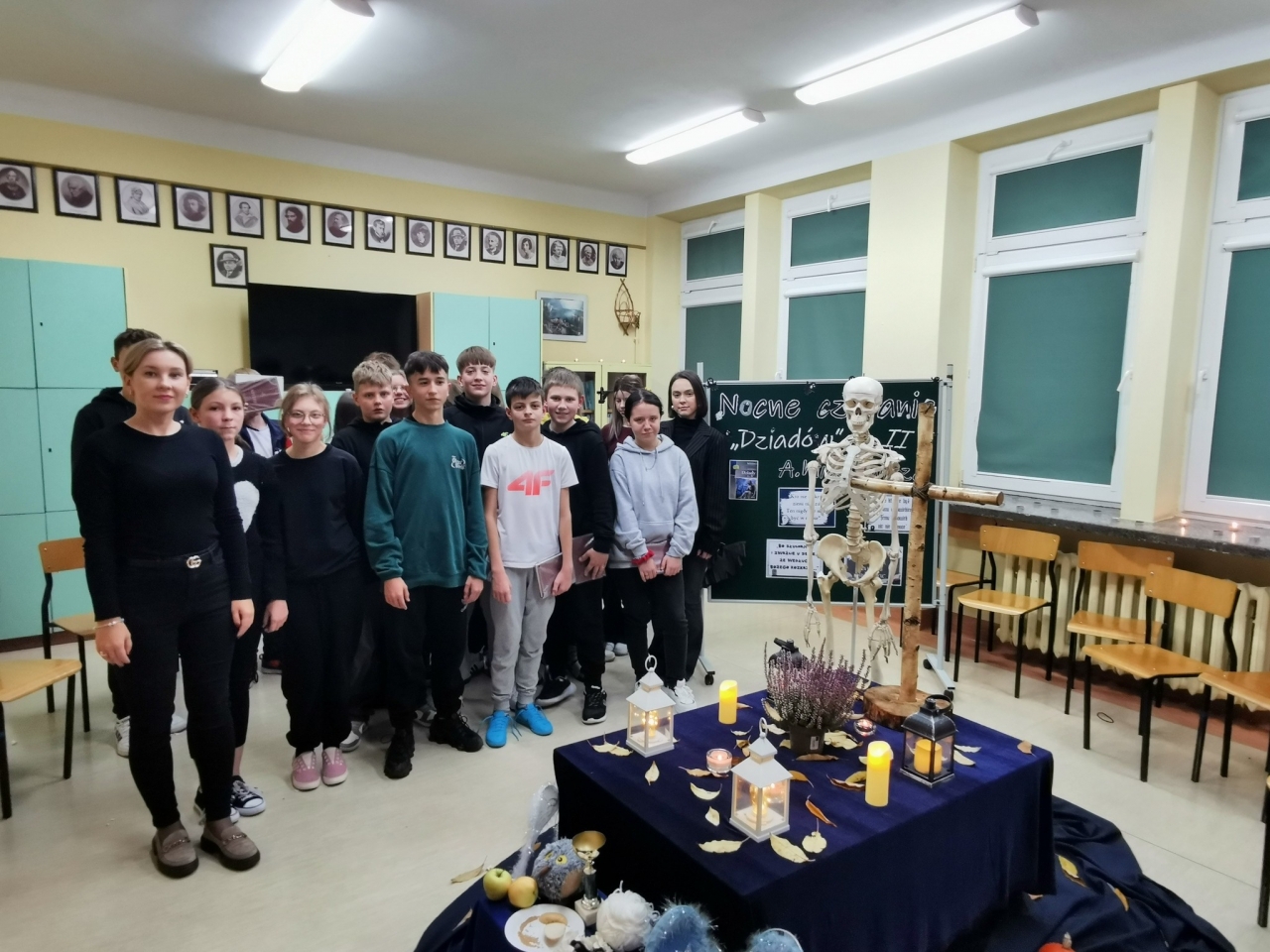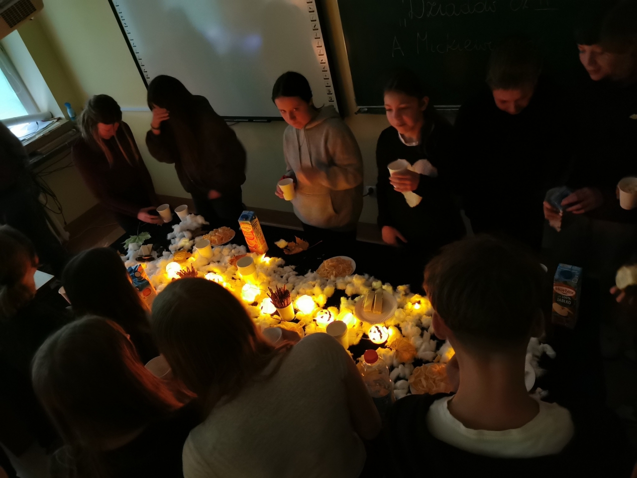 W wydarzeniu uczestniczyli uczniowie klas VII, którzy za pomocą efektownej scenografii przenieśli się do obrzędu dziadów.