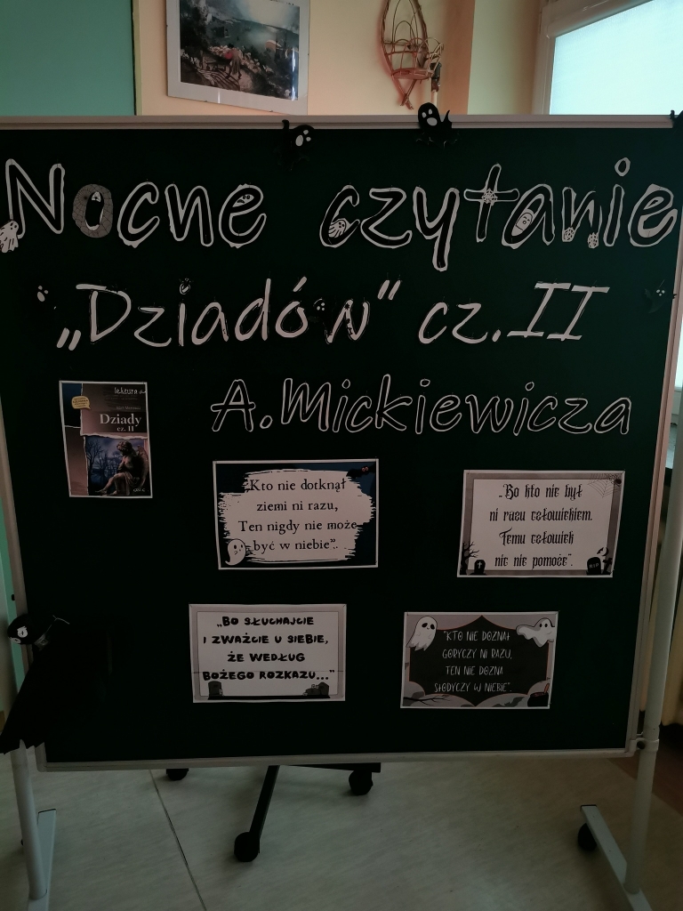 W ramach Międzynarodowego Miesiąca Bibliotek Szkolnych oraz zaciekawienia uczniów dramatem A. Mickiewicza, 30 października zorganizowaliśmy Nocne czytanie "Dziadów cz. II".